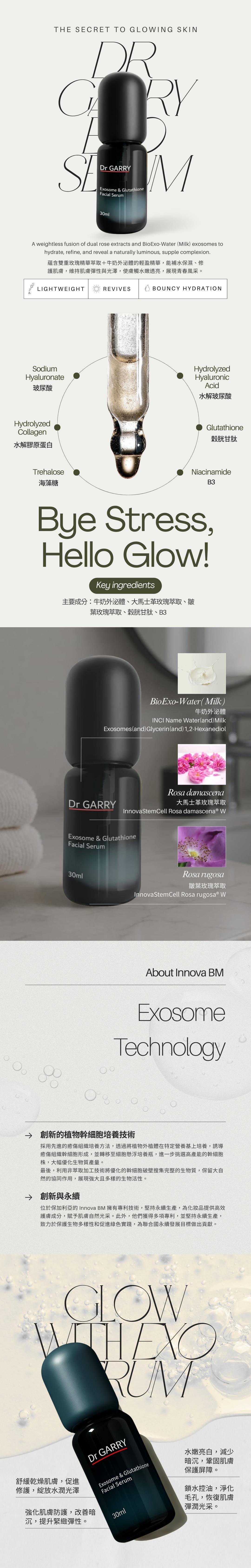 ⚫ DR GARRY Exo Serum - Rose (保加利亞玫瑰精油含天然dl-Citronellol / Geraniol) Ingredients: Water, Niacinamide, Trehalose, Sodium Hyaluronate, Hydrolyzed Hyaluronic Acid, Hydrolyzed Collagen, Malic Acid, Hydrolyzed Placental Extract, Rosa damascena Callus Culture Extract, Glycerin, Rosa rugosa Callus Culture Extract, BioExo-Water(Milk) , Glutathione, Arginine, Sodium Benzoate, Potassium Sorbate, Phenoxyethanol, Ethylhexylglycerin, Rosa Damascena Flower Oil, Coceth-7 (and) PPG-1-PEG-9 Lauryl Glycol Ether (and) PEG-40 Hydrogenated Castor Oil, Citronellol, Geraniol. 🟢 DR GARRY Exo Serum - Lavender (薰衣草精油含天然Linalool)
